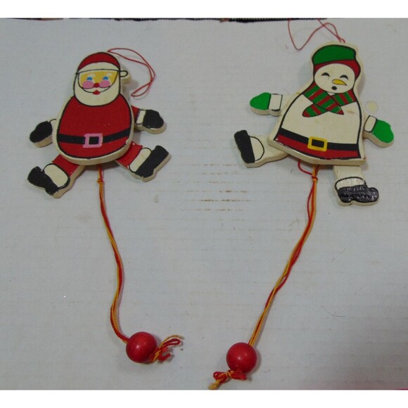 Santa and Snowman Jumping Jack Thick Wooden Pull Christmas Ornaments Vintage 80s