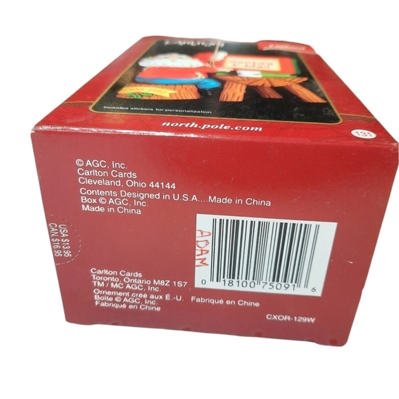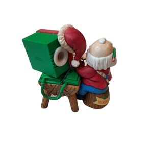 In like new condition Santa sitting at his desk on his computer Christmas ornament from Carlton Cards in box. This is a lighted ornament, a standard mini light is inserted into the side of the computer and the computer monitor swivels. The computer says "Boot Up a Happy Christmas". The stool has a banner "Merry Christmas 1997".