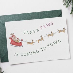 Santa paws is coming to town Christmas cards. Set of cute flat Christmas cards with Santa's sleigh. Set of six with white envelopes. 5.5x4.3".