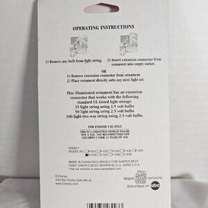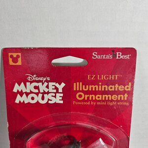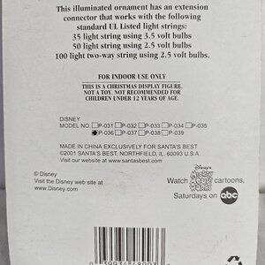 Description highlights: Santa's best Disney, Mickey Mouse ornament, (Mickey in marching band outfit and trumpet) Illuminated with mini light string 3.5 V. And 2.5 V suitable for indoor use only. Disney Model P036. Dated 2001. Not recommended for child under 12 years. Condition: Ornament still sealed in original plastic (Hard) and cardboard. Cardboard backing is in really nice condition. Non smoking pet free home.