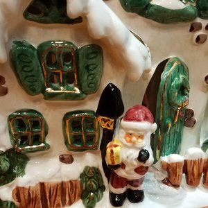Never used! Large ceramic tealight holder of Santa's "Cozy Corner" cottage house. A festive wintery scene with lots of 3-dimensional detail! Windows and roof have holes for passing light and ventilation. Can alternately be used as a potpourri holder! Comes in original box with Styrofoam and blue velvet, though outer box has some wear, please see all photos. Height at tallest: 9" Base width: Approx. 6"