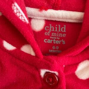 Charming red jacket with white polka dots. Features a cozy hood. Worn once no stains or rips. Adorable jacket!! Fleece for the colder weather great for layering under a heavy jacket