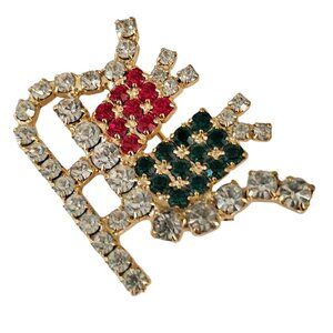 Santa's Sleigh Brooch Vintage Green Red Rhinestone Pin C449