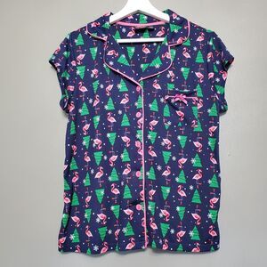 Santas Treasures Christmas Shorts Pajamas Womens Size Medium Blue Flamingo Xmas Tree