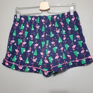 Santa’s Treasures Christmas Shorts Pajamas Size Medium Blue Flamingo Xmas Tree