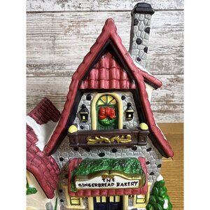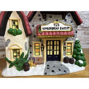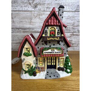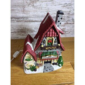The Santas Workbench Collection The Gingerbread Bakery Towne Series Lighted is a festive addition to any Christmas village display. Made of porcelain with a matte finish, this asymmetrical-shaped building features a multicolor gingerbread design that illuminates, adding a warm and whimsical touch to your holiday decor. Part of the Towne Series collection by Santa's Workbench, this Victorian-style village piece is perfect for any room and is sure to bring joy to your seasonal display. Excellent used condition. Original box and packing material included as is a cord and bulb.
