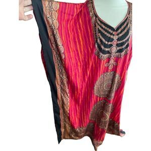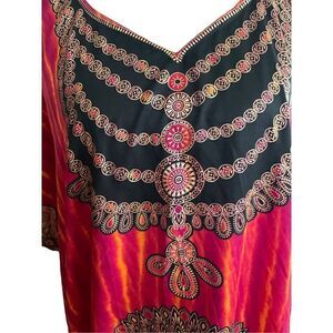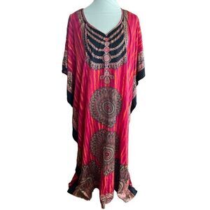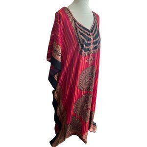 Absolutely stunning Kaftan, Tunic, Boho, Cover up with Red Black and Bronze colors, One Size Sante Classics. There are so many ways you can wear this Kaftan. Out to dinner, wear as a swim cover up, Super boho vibes, traditional Indian evening wear for special occasions. Free flowing