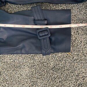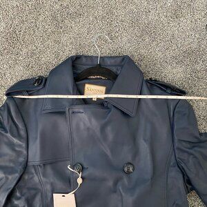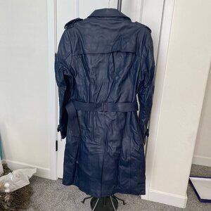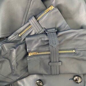 Beautiful military styled double breasted leather trench coat in navy blue, by Santinni London. Super soft leather. Belt attached, zippers at wrists. Neutral buttons.