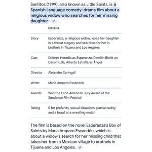 The film is based on the novel Esperanza's Box of Saints by María Amparo Escandón, which is about a widow's search for her missing child that takes her from a Mexican village to brothels in Tijuana and Los Angeles.
