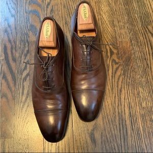 Stunning, luxurious Santoni brown cap toe oxfords with burnishing and patina work on the toe