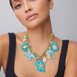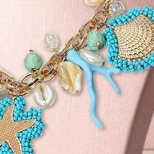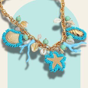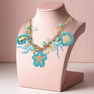 Featuring a brand-new, bold statement necklace featuring sea-themed charms including starfish, coral, shells, and beaded accents.
