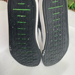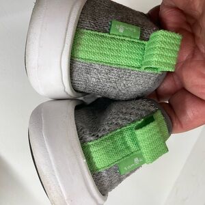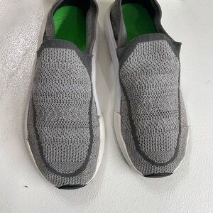 Comfortable slip-on design. Gray knit upper with green accents. Perfect for casual wear.