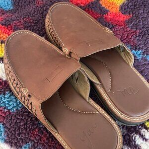 Gently used Sanuk Me Huarache slippers Mens size 10, designed with premium burnished leather and high rebound soft top for an unconventional appeal. Leather upper. Contoured leather lining and high rebound soft top footbed. Slip-on style. Stitched moc toe construction. Worn twice.