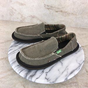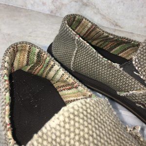 Comfortable Sanuk kids slippers. Slip-on style with textured fabric. Perfect for casual wear.