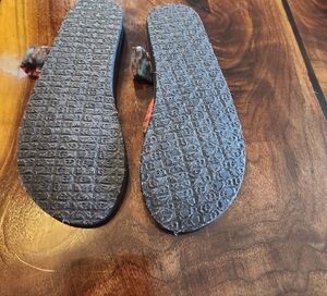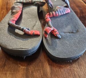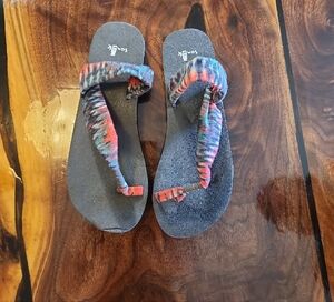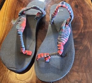 Comfortable Sanuk sandals with a vibrant tie-dye strap. have a few creases from being packed.