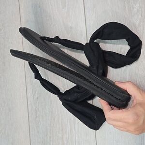 Stylish black sandals featuring a unique knotted strap design. Perfect for casual wear.