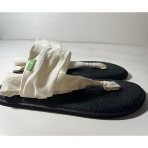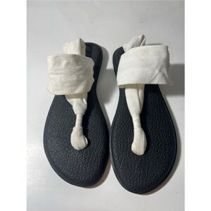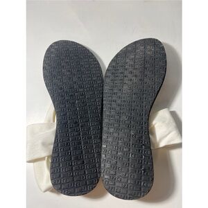 Stylish women's sandals featuring a chic black sole and elegant white straps. Perfect for casual outings and summer days.