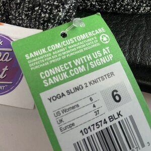 New with Tags is a pair of super comfortable yoga mat Sanuk sling back sandals, stretchy black and white fabric, they are the most comfortable sandal I have ever owned! I have like 6 pairs of them! It is like walking on clouds! Women's size 6.