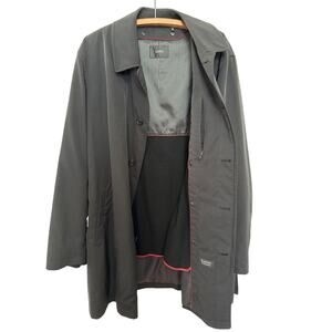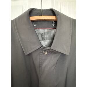 Sanyo New York Black preppy trench coat with removable inside wool liner, remove by button closing. Great business or dressy preppy coat for any occasion or even casual with a pair of jeans.