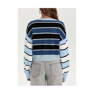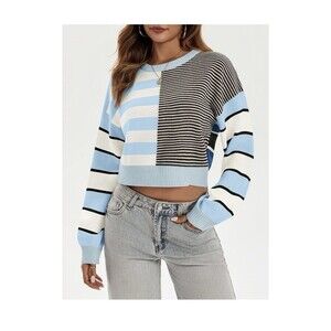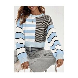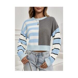 Saodimallsu Women’s Cropped Striped Knit Sweater Color Block Sky Blue Size L NEW