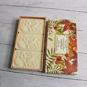 This set includes three decorative bars of scented soap with an embossed fruit design. The set is brand new and includes a decorative gift box. If you need more than one set, let me know and I will create a custom bundled listing. I also have other scents listed.