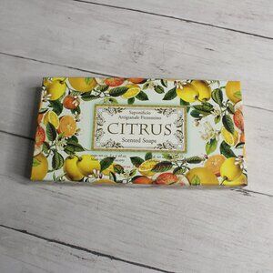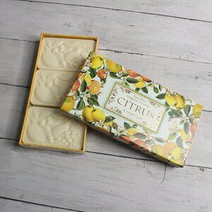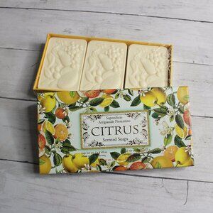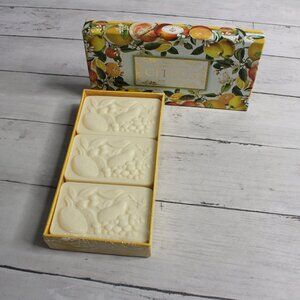This set includes three decorative bars of scented soap with an embossed fruit design. The set is brand new and includes a decorative gift box. If you need more than one set, let me know and I will create a custom bundled listing. I also have other scents listed.