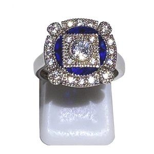 This design mixes synthetic "diamonds" & GENUINE sapphire blue spinels together to create a very unique deco, estate look. The backdrop of the round design is the deep cobalt sapphire blue color, created by the spinel stones. Sitting on top of that round vibrant blue background is a bezeled square, covered in tiny synthetic "diamonds" with a 4mm (quarter-carat) sparkling round stone in the center. The halo border of the design is an interesting mix of beaded silver edges & more clear, round synthetic "diamonds".