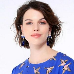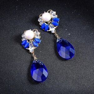 Sapphire Blue Crystal Rhinestone Pearl Vintage Gold Dangle Statement Earrings