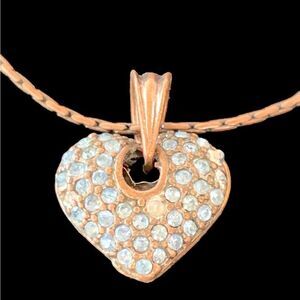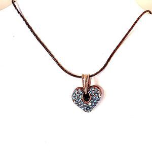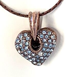 Unusual vintage copper necklace with a blue crystal pave heart. Very nice with a filagree back on the pendant. Measures 18” Long, please see all photos for full description.