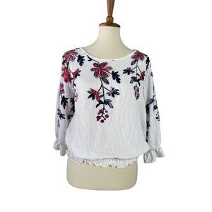 Sapphire Embroidered Floral Women's Medium Elastic Waist Blouse White Colorful