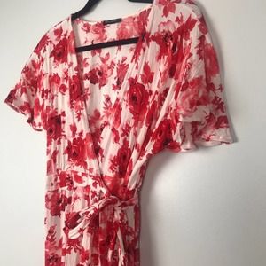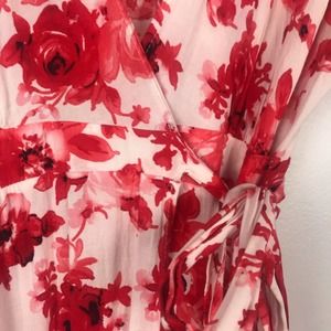 Purchased at Angl Boutique. White background with red rose print. True wrap dress. Short flutter sleeves.