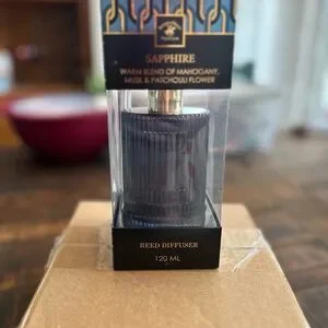 Sapphire reed diffuser with a warm blend of mahogany, musk, and patchouli flower. Elegant blue design.