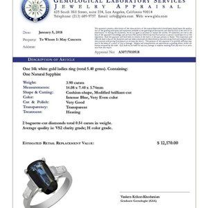 Intensely Blue Brilliant (Modified) Cut Natural Sapphire - 3.90 carats. Flanked by 2 Baguette-cut Diamonds - TCW 0.54, VS2 Clarity, H grade.