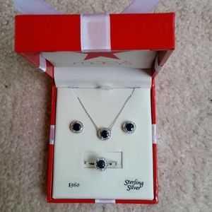 Faceted Stones Sapphire and White Topaz Sterling Silver Necklace, Earrings & Ring.