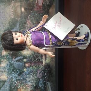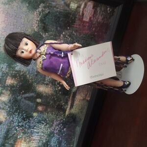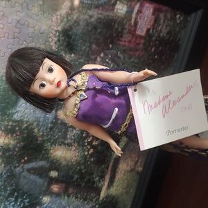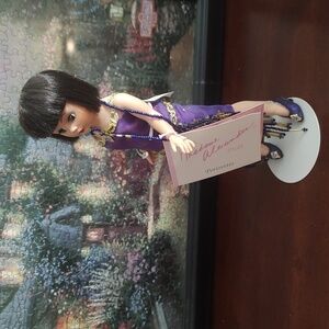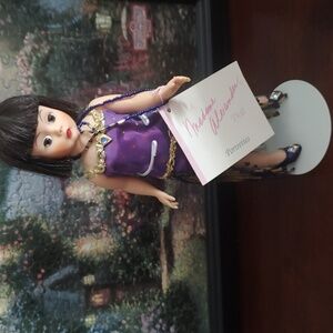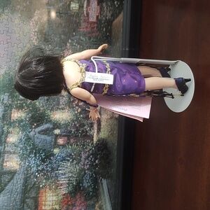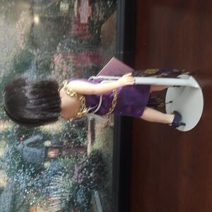 Elegant doll in a purple dress with gold details. Features a stylish bob haircut. Ideal for collectors.