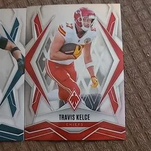 Two NFL player cards featuring Saquon Barkley in teal and white. Travis Kelce card in red and white. Bold player images and team color accents. Great for collectors.