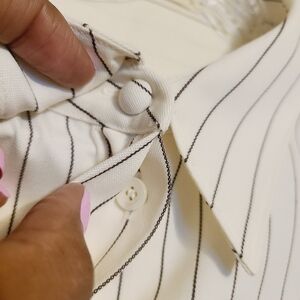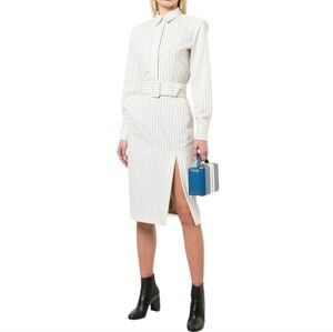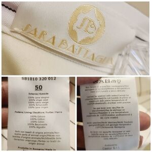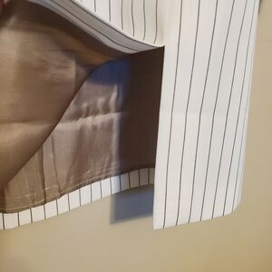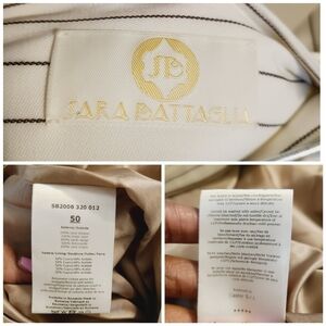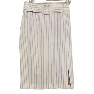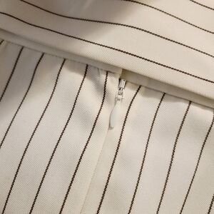 Look your best in this dazzling white and black striped skirt suit set from Sara Battaglia. Women's Italian size 50, or US size large. Skirt set is 100% Virginia wool; lining is 100% cotton.