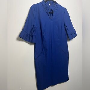Sara Campbell Ruffled V-Neck Bell Sleeve Shift Dress, darting at bust, functional pockets (still sewn shut), short sleeves, zipper closure in back. Material tag missing, VERY stretchy.