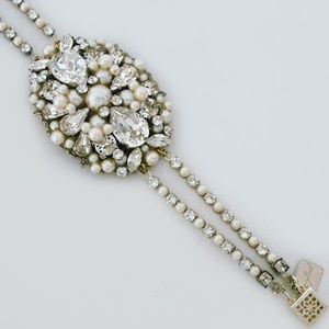 Daphne brooch bracelet features a statement center piece of Swarovski crystal teardrops and a range of crystalshapes and sizes adorned with a variety of round pearls. A dainty double chain of alternating petite pearls and crystals is finished with a square filigree clasp. Brooch is 2" x 1 5/8", bracelet is 6 1/2" in length with a tongue clasp. Available with pale ivory pearls. Designed by Sara Gabriel.