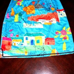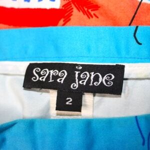 This pre-owned Sara Jane skirt (size 2) features a unique and whimsical illustrated print, giving it a charming retro feel. Proudly made in the USA with imported fabrics, this knee-length skirt (approx. 21 inches) offers a touch of quality and a potentially vintage appeal. It features a classic side zipper closure and is made from a comfortable blend of 97% cotton and 3% spandex. The "Dry Clean Only" care tag suggests a well-made garment from a past era. Add a touch of playful, unique style to your wardrobe with this special piece!
