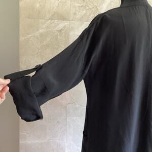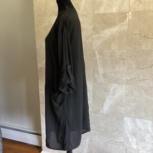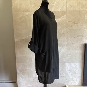 A study in restraint, this Sarah Lanzi shift dress offers clean lines and quiet structure. Crafted in lightweight viscose black fabric with a relaxed silhouette, it features a V-neckline, cuffed long sleeves with tab buttons, and front pockets that blend form with function. Italian-made, medium fit, gently worn. Ideal for transitional dressing, capsule wardrobes, or anyone curating with intention. ~$325 retail