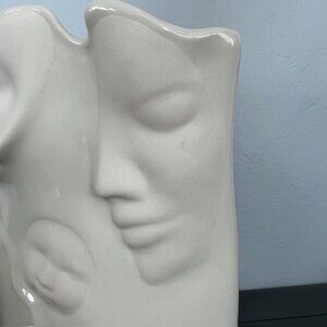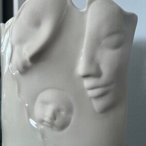 Signed and dated by the artist, this unique ceramic vase by Sara Lund features a compelling "husband, wife, and child" motif. The sculptural piece presents dual faces, carefully crafted in a modern, emotive style. Finished in a soft bisque glaze, the vase contrasts beautifully with the matte finish reserved for the faces, drawing attention to the delicate expressions and intimate family portrayal. A striking example of Lund’s work, this 2005 piece is both a functional vessel and a collectible piece of ceramic art.