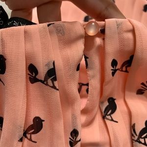 Beautiful pleated blouse with 3/4 ruched sleeves. The blouse is 100% polyester. The light and fresh material is perfect for summer! The blouse is a beautiful blush color, patterned with black birds throughout. If you have any questions or would like to see more photos, please contact me.