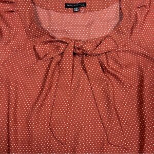 This relaxed blouse by Sara Michelle showcases a stylish tie front and cuffed sleeves, providing a comfortable and chic fit. The vibrant orange and white colors make it a standout piece for any occasion, adding a touch of elegance to your wardrobe.