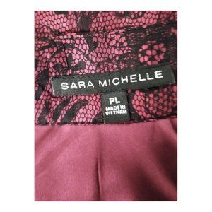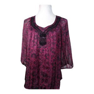 Gently used, excellent condition. Raspberry polyester satin blend. Black lace and beading overlay. Women's size petite large. Rounded neckline, 3/4 sleeves.