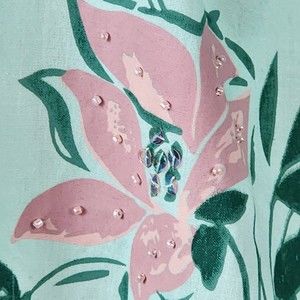 Sara Morgan Mint Green Cotton Blouse Top, Size L. Cute and casual, lightweight floral blouse. Floral print with pearl beads and sequin detail on some of the flowers. Sleeves are 3/4 length, cuffed. Popover style neckline with a full button front. Relaxed fit and lightweight. Poly, cotton blend.