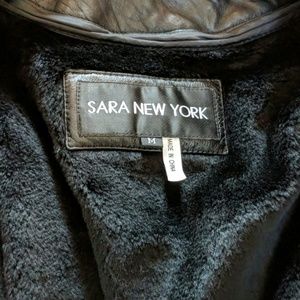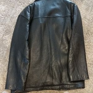 Black mens leather coat w/ furry zipper in lining inside pocket 5 buttons on the front