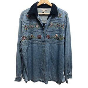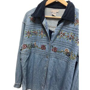 Sara Studio Vintage 90's Chambray Denim Corduroy Trim Vest Embroidered Shirt