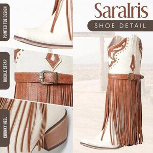 Step into chic Western fashion with the SaraIris Women's Western Booties, blending style, comfort, and durability. Featuring a 2.36-inch chunky heel, these boots offer elegant embroidered details, a pointed toe, and fringe accents, delivering a timeless cowgirl look. Crafted from high-quality microfiber, the soft upper provides comfort and flexibility, while the rubber outer sole ensures slip resistance for effortless walking. Whether dressing up for a wedding, party, or everyday wear, these pull-on mid-calf boots are the perfect addition to any wardrobe.
