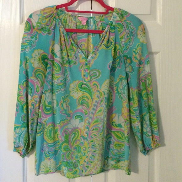 Shorely blue double trouble spring 2015 gently used, accidentally got dried (Opps) only small tearing on neck line, but hardly noticeable!! Super cute with jeans